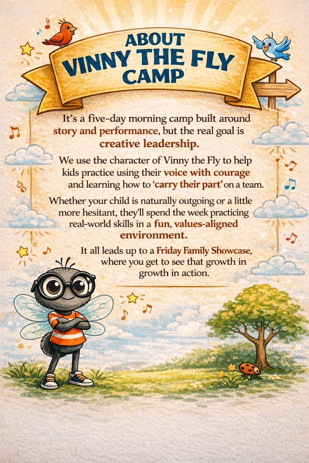 Kids will spend the week stepping into the world of Vinny the Fly through creative rehearsals, speaking parts, teamwork challenges, and leadership moments that help them use their voice with courage and learn how to carry their part on a team.